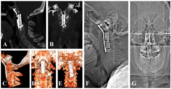 Postoperative CT scans (A,B), 3D reconstructions (C–E), and lateral (F) and anterior (G) x-rays show the clivus-cervical C3 stabilization and vertebrocementoplasty of the left lateral mass of C1 and the body of C3.