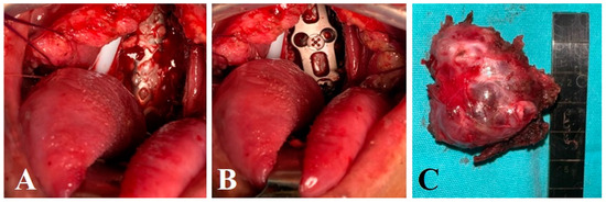 Transoral approach shows pre-modeled cervical mesh (A) and anterior cervical plate (B) placed with screws. Axial (C) The surgical specimen measures 5 × 6 cm, approximately 60 cc in volume, and weighs 16 g with a firm consistency.