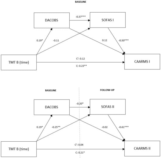 The Pearson’s correlation analysis with FDR correction for multiple comparisons (Table 4) indicated that it was the TMT B execution time that correlated with almost all of the other results (what is the most important is that this variable was associated with the first mediator, DACOBS, while the TMT A execution time was not); therefore, this variable was included in the mediation models. The table also shows that the DACOBS, as the first potential mediator, negatively correlated with both measurements of the SOFAS scale, which was selected as the second mediator. Moreover, almost all variables correlated with both the CAARMS measurements (the exception was the DACOBS scale, which was only correlated with CAARMS I (according to the new approach to mediation analysis [101,102], the lack of a significant simple correlation of the mediator with the dependent variable does not exclude this mediating variable from further analysis. Only the relationship between the independent variable and the mediator is necessary to test a mediation model. This is due to the fact that the impact of the mediator on the dependent variable is always analyzed simultaneously with the impact of the independent variable on dependent variable, while the relationship between the independent variable and the mediator is calculated as a simple regression (in first step of the analysis)).