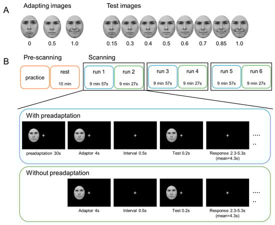 Stimuli and experimental design. (A) Three adapting images (i.e., sad, neutral, and happy adaptors) and eight morphed test images (i.e., happy proportion equals 0.15, 0.3, 0.4, 0.5, 0.6, 0.7, 0.85, 1.0). The original images of three adaptors were obtained from the KDEF database [53] (http://www.emotionlab.se/resources/kdef, accessed on 5 September 2018). All test images utilized in the experiment were created by WebMorph (STOIKimage, https://webmorph.org, accessed on 5 September 2018) according to the three adaptors. (B) General experimental procedure outline and single trial procedure. The orange box represented the program before scanning. Blue and green boxes represented the first and second runs with and without 30 s of preadaptation under each adaptor condition, respectively.