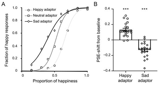 Three facial images showing happy (happy proportion equals 1), neutral (happy proportion equals 0.5), and sad (happy proportion equals 0) expressions on one male person were selected from the Karolinska Directed Emotional Faces database (KDEF) [53] as adapting images. All test images used in the experiment were generated using WebMorph (STOIKimage, https://webmorph.org, accessed on 5 September 2018). In line with prior research [20,21,22], we employed a morphing technique to blend the sad facial image with the neutral facial image, resulting in a series of images exhibiting varying proportion of happiness ranging from 0 to 0.5. Similarly, we morphed the neutral image with the happy image to create another series of images from 0.5 to 1. In the current experiment, eight images with proportions of happiness equal to 0.15, 0.3, 0.4, 0.5, 0.6, 0.7, 0.85, and 1.0 were chosen as test images to generate robust and informative psychometric curves (Figure 1A). All adapting and test images were converted to grayscale and cropped into an oval shape to remove external features. In addition to the eight test images, two grating images titled 45° to the left or right of the vertical axis were included for other purposes.