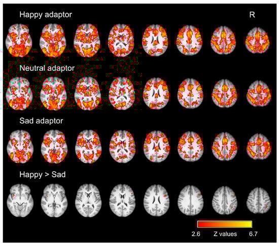 Brain regions showing different neural activations across the three types of adaptor conditions (i.e., happy, neutral, and sad) during emotion judgment on the neutral test images. All activations were whole-brain-corrected and -thresholded at Z > 2.6. R = right.