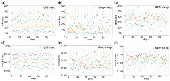 Percentiles of sleep stages in relation to the homeostatic and the circadian component of sleep timing. The percentiles indicate at what points in time 25% (blue dots), 50% (orange dots), 75% (green dots) and 100% (red dots) of (a,d) light sleep, (b,e) deep sleep and (c,f) REM sleep have been reached. The sleep stage percentiles were determined in relation to (a–c) minutes after sleep onset and (d–f) clock time, reflecting the homeostatic and circadian component, respectively. Vertical lines indicate weekend/work-free days.
