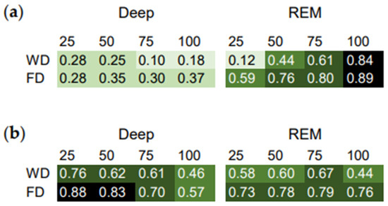 The ICC of the sleep stage percentiles with the midpoint of sleep increase progressively with the time elapsed since falling asleep (Figure 5a). This suggests an increasingly strong temporal relationship between the sleep stages and total sleep with regard to the homeostatic component. This is consistent with a homeostatic forward regulatory “hourglass” mechanism that controls the timing of REM sleep episodes in rodents [25,26,27]. In contrast, with respect to clock time, early deep sleep is more strongly associated with total sleep than late deep sleep (Figure 5b). This suggests a stronger temporal relationship between early deep sleep and total sleep with regard to the circadian component. For all REM sleep percentiles, the correlation with total sleep relative to clock time is high. This suggests a strong temporal relationship between REM sleep and bedtime. This is consistent with the concept of tight control of REM sleep timing by the circadian process of sleep regulation, which is mainly based on experiments under artificial conditions [10,11,12,28,29,30]. However, under artificial conditions, the distortion by stress hormones, which strongly influence the circadian system, cannot be ruled out [31]. Our real-life study therefore makes an important contribution to understanding the temporal control of sleep stages.