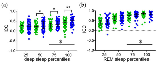 The ICC of the stage percentiles and midpoint of sleep in clock time (Figure 2b) were highest for the earlier deep sleep percentiles. This indicates the strongest phase relationship between total sleep and early deep sleep in relation to the circadian component, in this subject.