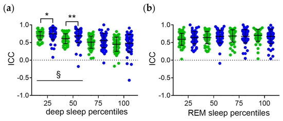 Temporal relationship between the sleep stages and total sleep with regard to the circadian component. Intraindividual correlation coefficients (ICC) of midpoint of sleep and the (a) deep and (b) REM sleep percentiles relative to clock time. Workdays (green symbols) and free days (blue symbols) were evaluated separately to account for workday constraints. Middle lines and error bars show median with interquartile range (n = 59). Wilcoxon test *, p < 0.01; **, p < 0.01. §, p < 0.05 vs. the respective 100 percentiles.