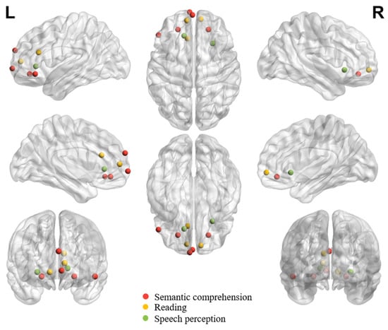 Figure 3 demonstrates individual peaks from neuroimaging studies on processing multimodal information, understanding emotional meanings in and with language, and strategies for using socially appropriate languages in healthy adults. It can be seen from Figure 3 that the peaks are bilaterally distributed across the study focuses. Moreover, the peaks from studies on communicators’ strategies of using socially appropriate and pragmatic felicitous languages are more anteriorly distributed than those from studies on multimodal information processing and emotional meaning understanding.