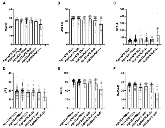 A total of 537 participants underwent age interaction analysis. Within the APOEε4+ subgroup, statistically significant distinctions were observed in comprehensive cognitive function (MMSE, MoCA-B, MES), memory function (AVLT-R), language function (VFT), and executive function (STT-A) across the three delineated groups (p < 0.05) (Table 5). These findings suggest that cognitive impairment tends to intensify with advancing age, and this phenomenon is notably accentuated in individuals carrying the ε4 allele. The interaction between cognitive function and age among ε4 carriers was further explored utilizing a general linear model (Figure 1).