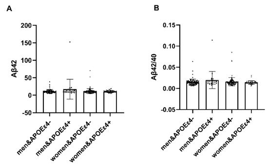 Amyloid-β (Aβ) stands as the distinctive pathological hallmark of Alzheimer’s disease (AD), and ongoing research is dedicated to exploring plasma biomarkers associated with the pathology of this neurodegenerative condition. Presently, the detection of plasma amyloid-β (Aβ) proves instrumental in identifying the characteristic pathology of AD, thereby significantly enhancing the diagnostic efficacy for AD’s distinctive pathological features [27]. Our affirmative findings pertaining to analyses involving Aβ42 and the Aβ42/Aβ40 ratio in APOEε4+ women, suggest the active involvement of ε4 in the pathological alterations associated with AD. These results, in turn, offer a more precise biochemical representation of the Alzheimer’s disease risk.
