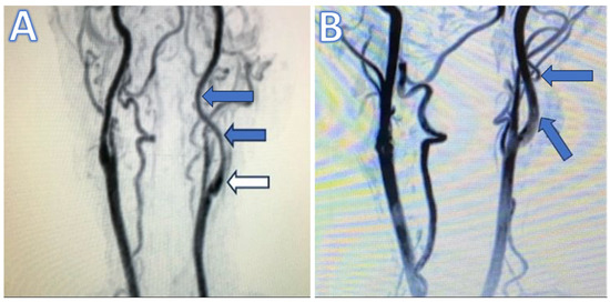 (A) Preoperative magnetic resonance (MR) angiography illustrating long-segment tubular stenosis. Blue arrows point to the tubular stenotic sections, while white arrow indicates the unaffected carotid bulb. (B) Postoperative MR angiography in the first month shows the dilatation of the internal carotid artery (blue arrows) compared to the preoperative MR angiography.