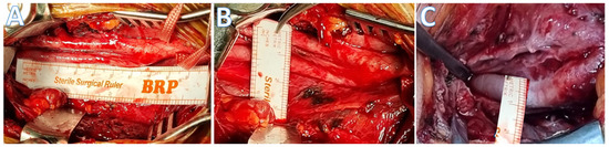 Our surgical intervention aimed to alleviate the hemodynamic compromise associated with long-segment tubular stenosis of the internal carotid artery, as depicted in Figure 2. Access to the carotid vasculature was facilitated through a strategically placed curvilinear incision extending from the angle of the mandible to the cervical region, delineating the carotid bifurcation. The dissection was meticulously advanced to isolate the common carotid artery and further delineate both the external and internal carotid arteries. Notably, the external carotid artery presented with a caliber equal to or exceeding that of the internal carotid artery, an observation crucial for preoperative planning. The pathological segment, characterized by stenosis, was exposed over its entire length, necessitating extensive dissection to enable comprehensive treatment. The surgical strategy included the administration of papaverine to effectuate vasodilation, followed by a precise sympathectomy along the afflicted segment. This approach is called perivascular sympathectomy [17]. Upon exposure of the internal carotid artery and during the perivascular sympathectomy, a thickened fibrotic adventitial layer was observed. Perioperatively, before the intervention, the arterial pulsation was almost invisible; however, following the intervention, we observed a significant resurgence in pulsation and dilation of the artery, indicative of the re-established blood flow and procedural success in different instances. In this study, all patients exhibited a notable characteristic: the carotid bulb segment was consistently intact and free from stenotic changes. The stenoses observed in each case were localized distal to the carotid bulb, as depicted in Figure 2.