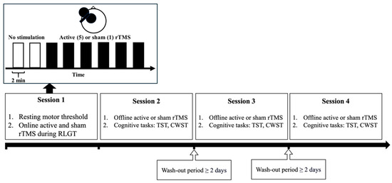 - Li, Y.; Wang, L.; Jia, M.; Guo, J.; Wang, H.; Wang, M. The effects of high-frequency rTMS over the left DLPFC on cognitive control in young healthy participants. PLoS ONE 2017, 12, e0179430. [Google Scholar] [CrossRef]