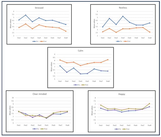 In the following graphs, it is possible to visualize the trends of the five moods during the 8 days of training by observing the pre- and post-practice scores (see Figure 2). From a qualitative point of view, perceived stress and restlessness were decreased after the practice, while calmness was improved. For happiness, the trend was similar, but the effect was smaller, while for clarity of mind, the two lines overlapped.