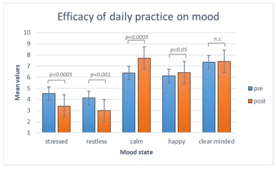 Before and after each daily practice, the participants completed the mood scales about stressed, restless, calm, happy, and clear minded states. In the histogram above, the mean mood states before (blue) and after (orange) the daily practice are represented. Over each comparison, significant and non-significant (n.s.) effects are indicated.