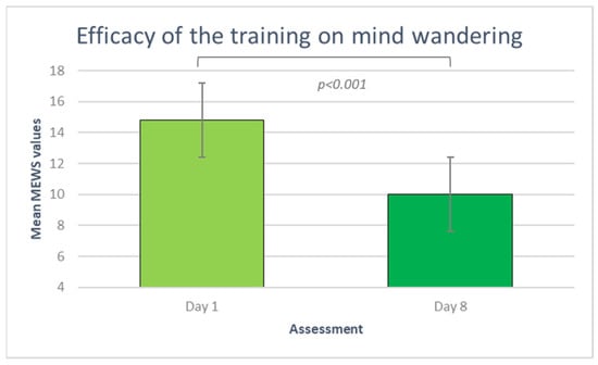 The modified version of the Mind Excessive Wandering Scale was administered only after the practice since it referred to mind fluctuations experienced during the practice. Thus, in the graph, it is possible to visualize the trend during the 8-day training program (see Figure 3).