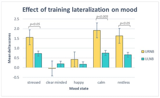 In detail, the URNB group obtained higher gains than the ULNB group for stressed (MURNB = 1.56; sdURNB = 0.64. MULNB = 0.73; sdULNB = 0.66), restless (MURNB = 1.64; sdURNB = 0.9. MULNB = 0.66; sdULNB = 0.9), and calm states (MURNB = 1.91; sdURNB = 0.83. MULNB = 0.75; sdULNB = 0.64).