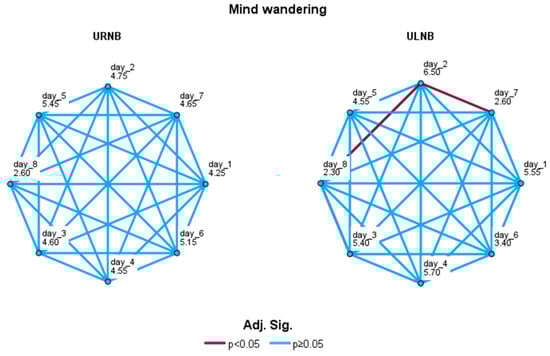 Pairwise comparisons of daily mind wandering values with Friedman test. Significant values were adjusted by Bonferroni correction for multiple comparisons. Each node represents daily assessment and shows average rank. Significant comparisons are displayed in Bordeaux; non-significant comparisons are displayed in blue.