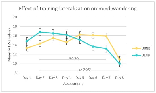 Furthermore, mind wandering significantly decreased as a function of time, so practice progression produced better results. Moreover, from a qualitative point of view, the most effective sessions emerged during in-presence training. Taken together, these findings suggest that some results occur as a function of time, while others can be obtained more rapidly. Single sessions may have a high impact on producing positive emotions, especially using the URNB, coherently with other studies using meditation techniques [69]. Deeper and more lasting outputs require more sessions [70]. Reducing mind wandering may require several sessions of ULNB. Furthermore, in-presence training seems to be more effective than solo training. This consideration can be obvious; however, it is important to use mixed methodologies, since self-administered activities are more flexible and might play a vital role in practical applications in contexts where people cannot move due to health or geographical constraints. Thus, it is important to test and validate methods that include remote and/or asynchronous activities. Previous studies on different mediation practices already proved the validity of asynchronous programs (e.g., [71]).