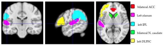 Illustration of the five regions of interest (ROIs): bilateral ACC, left planum temporale, left IPL, bilateral nucleus caudate and left DLPFC. The images are displayed using the neurosciences convention; the left hemisphere is on the left side.