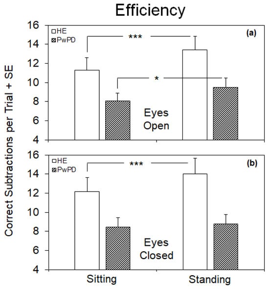 Mean values (+standard error, SE) of the efficiency (number of correct subtractions during the 60-s trial) of the arithmetic task in healthy elderly (HE) subjects and patients with Parkinson’s disease (PwPD) under sitting and standing conditions with eyes open (a) and eyes closed (b). With eyes open, in both HE and PwPD efficiency was higher on standing than sitting, whilst with eyes closed efficiency increased only in HE. *, p < 0.05; ***, p < 0.001.