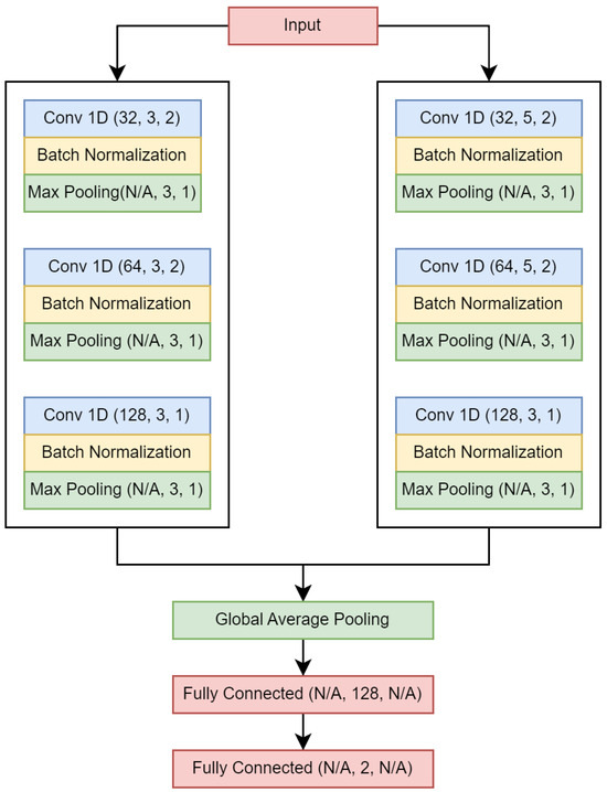 The model is a Siamese convolutional neural network (CNN), and is illustrated in Figure 2. The convolutional layers utilize ReLU as the activation function, while Softmax is applied to the output layer for activation. A dropout layer is appended between the fully connected layers, with a dropout rate equal to 0.25. Throughout the remainder of this document, this model is referred to as Wang_1d. We used different parameters than those used in [30]. The Adam algorithm was employed as the optimizer, using the following parameters: , and . Binary cross-entropy was used as the loss function and accuracy as the evaluation metric. The number of epochs and the batch size were both 100.