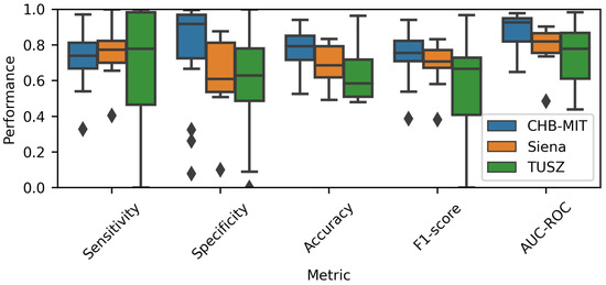 To depict the individual prediction behavior of the models, Figure 5 displays the model performance for each EEG dataset. It includes the metrics for all patients (the number of subjects can be observed in Table 1). A overlap was used to generate this chart. The median of the CHB-MIT results was higher than that of the other two datasets; this situation applied to four metrics, specificity, accuracy, F1-score and AUC-ROC. Therefore, it can be intuited that the Wang_1d model performed best when using the CHB-MIT dataset.