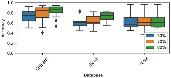 Figure 6 shows the model accuracy when varying the overlap rate. As stated, the overlap was only applied to generate the training dataset, not the evaluation one. When using the CHB-MIT and Siena datasets, it was noted that the overall accuracy increased when the overlap increased. On the other hand, the TUSZ-related models did not show this behavior. Again, the TUSZ-related ranges were the largest among the three datasets. It is noticeable that, visually speaking, there is no effect when using different window overlaps and the accuracy is lower among all datasets.