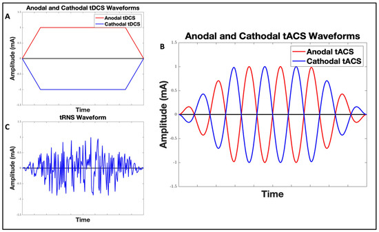 Demonstration of Transcranial Direct Current Stimulation (tDCS) (A), Transcranial Alternating Current Stimulation (tACS) (B), and Transcranial Random Noise Stimulation (tRNS) (C) waveforms. The red waveform represents the anodal current, and the blue waveform represents the cathodal current in tDCS and tACS. tDCS features a constant, flat waveform, while the waveform of tACS varies according to its frequency, and tRNS exhibits a waveform with a randomized frequency. In tDCS, the anode increases neural excitability while the cathode decreases it. However, tACS uses a sinusoidal waveform, meaning the current alternates between positive and negative values, minimizing the distinction between anodal and cathodal effects [29].