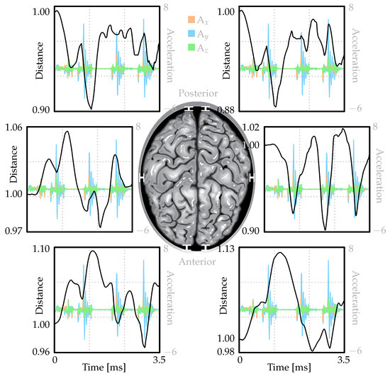 Figure 5 illustrates the movement of the brain relative to the skull during head accelerations commonly observed in seizures (see Figure 4). The graph presents scaled distances between the skull and brain at six different locations over time. These measurements have been adjusted based on their initial values before the seizure (T = 0 ms). When the values exceed one, it signifies an increase in separation between the brain and skull, whereas a value below one denotes a decrease in distance. Despite experiencing oscillatory acceleration patterns (also depicted in the graphs), the fluctuations in brain–skull distances are relatively smaller due to CSF’s cushioning effect.