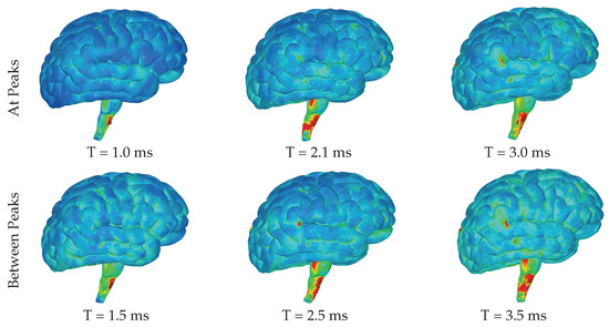 The highest levels of contact pressure resulting from the movement of fluid particles around the brain, as shown in Figure 6, are primarily observed on the posterior sides of the gyri and brainstem following both the initial and third acceleration peaks. Similarly, according to the color map indicating effective stress values, significant stress is exerted on different areas of the brain after both accelerations; however, notably high-stress values occur specifically within the brainstem and the posterior regions of the gyri (Figure 7). Again mirroring trends seen with contact pressure and effective stress, when calculating maximum shear stress values exerted on the brain, elevated levels can be observed primarily within the brainstem (Figure 8 and Figure 9). Notably, these elevated values seem to be more pronounced on the left side of the brainstem (Figure 8) than on the right side (Figure 9), indicating an asymmetry in exerted stress on the brain.