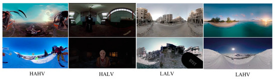 Given the deficiency in required expertise [25], the inability to access gold-standard equipment, suitable controlled environments, and the VR materials in the field of affective computing [26], the emotional elicitation video stimuli utilized in the experiment were sourced from an immersive VR video public database at Stanford University [27]. This dataset includes 73 immersive VR clips, each assigned a valence and arousal score within the four quadrants of Russell’s emotion model [28]. On this valence–arousal (VA) plane, the four quadrants are HAHV, HALV, LALV, and LAHV.