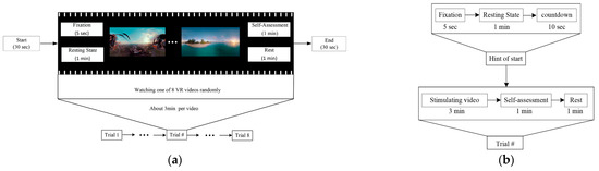 Figure 4a illustrates the experimental procedure for each trial, consisting of a baseline phase and nine trials. The first trial is a test trial intended to familiarize subjects with the experimental procedure. The specific process for each trial is shown in Figure 4b. After the experiment started, eight VR videos were presented in random order across the eight trials. Each trial included three steps. First, a fixed plus sign is displayed for five seconds. Second, the subjects randomly watched one of the VR videos. Following each viewing, participants were prompted to subjectively assess their present emotional state. To mitigate potential artifacts stemming from frequent donning of the VR head-mounted display (VR HMD) and potential disruption to EEG electrode positioning, the SAM emotional scale was presented on a virtual screen. This functionality enabled subjects to complete the SAM emotional scale using the VR controller without the need to remove the VR HMD. The scoring and rest process took approximately three minutes. During this time, subjects can also recuperate from the preceding emotional induction phase to avoid fatigue. Each VR video lasts approximately three minutes. The experiment took approximately one hour to complete. The total duration of the experiment was kept concise to prevent fatigue in the subjects.