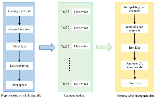 Clean and high-quality EEG signals were obtained through preprocessing the experimental data using EEGLAB 2021.1, an open-source MATLAB 2021b toolbox renowned for its robust EEG preprocessing capabilities, feature extraction, and emotion recognition algorithms [29]. As depicted in Figure 5, the data preprocessing included the following steps: first, importing the raw EEG data into MATLAB; second, locating the electrode points; third, applying FIR bandpass filtering in the range of 0.1–75 Hz to minimize the introduction of artifacts and filtering out 48–52 Hz electrical noise; fourth, downsampling the data to 200 Hz; fifth, segmenting the data based on marker labels, and dividing each subject’s collected EEG data into eight trials, with each trial comprising approximately three minutes of video playback (video data). Subsequent preprocessing for each trial involved bad lead interpolation and bad segment removal, using independent component analysis to eliminate artifacts such as blinking, eye drift, and electromyographic noise.