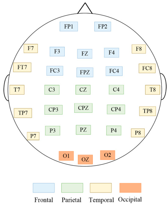 As shown in Figure 6, the following brain regions and channels were selected for analysis in this study to explore the results of PSD differences in the and frequency bands across different brain areas: the frontal region (FP1, FP2, FZ, F3, F4, FCZ, FC3 and FC4), parietal region (C3, CZ, C4, CP3, CPZ, CP4, PZ, P3 and P4), temporal region (F7, F8, FT7, FT8, T7, T8, TP7, TP8, P7 and P8), and occipital region (OZ, O1 and O2).