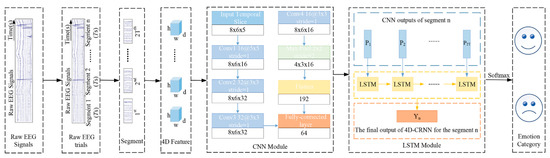 To delve deeper into the differences in EEG signals for emotional arousal between the two modes and effectively integrate the spatial-frequency-temporal information of EEG, Figure 7 illustrates the proposed hybrid model that combines DE, CNN, and LSTM, namely, the DE-CRNN EEG emotion recognition architecture. This architecture comprises six parts: original EEG signals, original EEG trials, EEG segments, the 4D spatial-frequency-temporal structure, the CRNN, and EEG classification results. Below, the details of the 4D spatial-frequency-temporal structure, CRNN, and classifier are sequentially described.