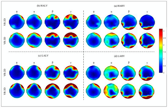 Overall, the brainwave energy induced by VR-3D videos is significantly higher than that of VR-2D videos (mainly concentrated in the frontal, temporal, and occipital regions of the brain).