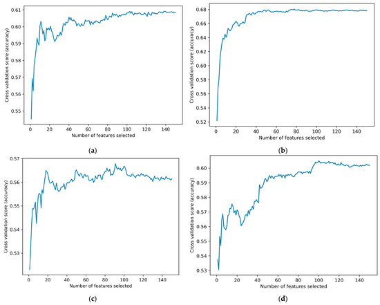 During the EEG-based emotion classification process, each subject has 14,400 samples, with each sample comprising 30 × 5 = 150 features. As illustrated in Figure 10, the optimal number of features is determined based on their effectiveness in predicting the model’s output. Ultimately, 91 features were selected for the arousal dimension in VR-2D mode, 100 features for the arousal dimension in VR-3D mode, 139 features for the valence dimension in VR-2D mode, and 78 features for the valence dimension in VR-3D mode for classifying brain activation states.