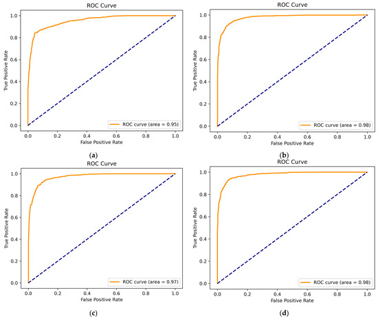 The receiver operating characteristic (ROC) curves and the area under the ROC curve (AUC) for each subject were calculated. The ROC curve directly reflects the strengths and weaknesses of the sensitivity and specificity metrics. The AUC, being the area under the ROC curve, provides a direct observation of the classifier’s performance. A larger AUC value indicates better performance. This paper applied the microaverage method to obtain the ROC curves, and Figure 11 displays the ROC curves and AUC values for the EEG emotion recognition experiment results across the dimensions of valence and arousal in the two modes.