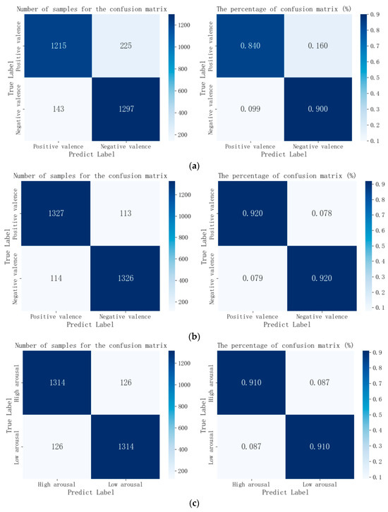 Additionally, the percentages and corresponding sample numbers of the confusion matrix for emotion states based on the SVM algorithm are shown in Figure 12. In the confusion matrix, rows represent true values, and columns represent predicted values.
