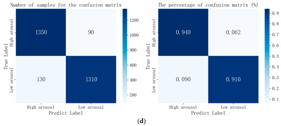 Confusion matrix for subjects. (a) The confusion matrix for the valence dimension under the VR-2D mode; (b) the confusion matrix for the valence dimension under the VR-3D mode; (c) the confusion matrix for the arousal dimension under the VR-2D mode; (d) the confusion matrix for the arousal dimension under the VR-3D mode.