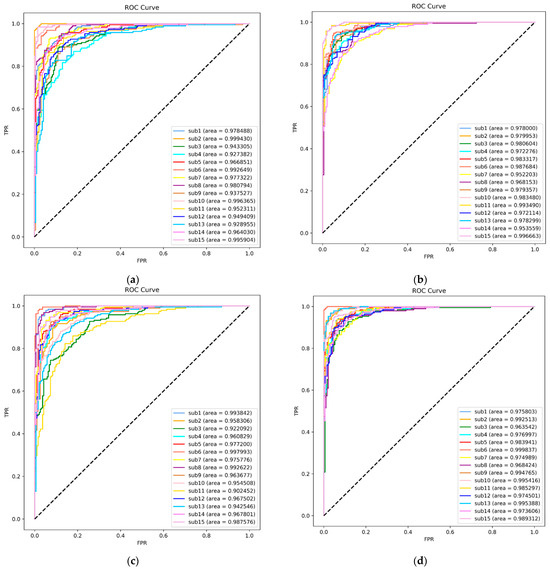 Figure 14 exhibits the ROC curves and AUC values for the EEG emotion recognition experiment results for valence and arousal dimensions across the two modes. ‘sub1’ represents the ROC curve and AUC value for Subject 1’s results, and the pattern is similar for other subjects. Notably, each subject’s AUC value reaches a high level, indicating that the model is robust.