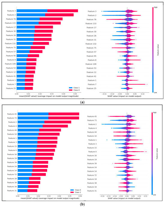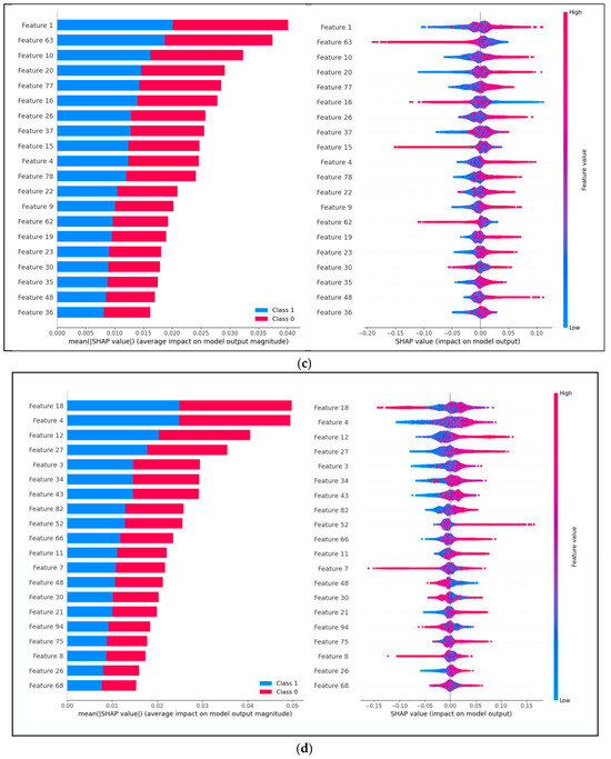 As depicted in Figure 15, explanations for all sample predictions are presented in two graph types. The first type is the standard bar chart derived from the average absolute values of the shap values for each feature, showing the contribution of each feature to the prediction probability. The second type comprises scatter plots that simply depict the shap values for each feature of each sample. The color coding in these plots illustrates the relationship between the magnitude of feature values and their predictive impact and shows the distribution of these feature values. Specifically, (1) Figure 15a indicates that in the valence dimension under VR-2D mode, Features 3, 2, and 76 are important; (2) Figure 15b shows that in the valence dimension under VR-3D mode, Features 45, 73, and 2 are significant; (3) Figure 15c reveals that in the arousal dimension under VR-2D mode, Features 1, 63, and 10 are important; and (4) Figure 15d demonstrates that in the arousal dimension under VR-3D mode, Features 18, 4, and 12 are important.