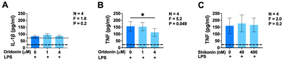 Effects of oridonin and shikonin on the secretion of IL-1β and TNF by LPS-stimulated BV-2 murine microglia. Two different concentrations of either drug or the vehicle solution (DMSO) were added to BV-2 cells 30 min before their stimulation with LPS (100 ng/mL). Following 24 h incubation, concentrations of IL-1β (A) or TNF (B,C) in cell-free supernatants were determined using ELISAs. Data from four independent experiments performed on separate days are presented as mean ± SEM. * p < 0.05 according to Dunnett’s post hoc test. F- and p-values displayed on the graphs were calculated using a one-way randomized block ANOVA. The dashed lines indicate the detection limits of the ELISAs. The dotted lines represent the baseline concentrations of IL-1β (A) and TNF (B,C) measured in the supernatants of unstimulated BV-2 murine microglia incubated in the absence of LPS.