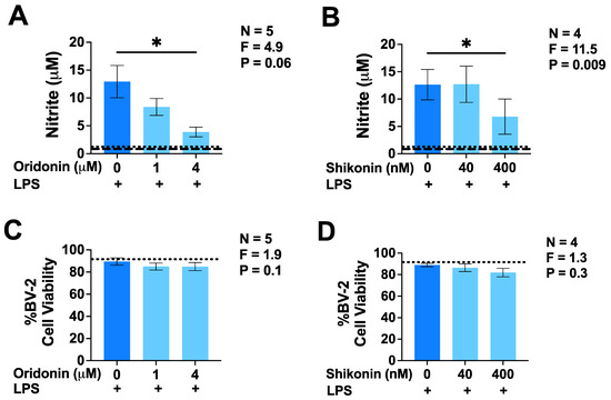 Effects of oridonin and shikonin on the NO secretion and viability of LPS-stimulated BV-2 murine microglia. Two different concentrations of either drug or the vehicle solution were added to BV-2 cells 30 min before their stimulation with LPS (100 ng/mL). Following 24 h incubation, concentrations of nitrite in cell-free supernatants were measured using the Griess assay (A,B) and the viability of BV-2 cells was measured using the MTT assay (C,D). Data from four to five independent experiments performed on separate days are presented as mean ± SEM. * p < 0.05 according to Dunnett’s post hoc test. F- and p-values displayed on the graphs were calculated using a one-way randomized block ANOVA. The dashed lines indicate the detection limit of the Griess assay. The dotted lines represent the baseline nitrite concentrations (A,B) or cell viability values (C,D) obtained from unstimulated BV-2 murine microglia incubated in the absence of LPS.