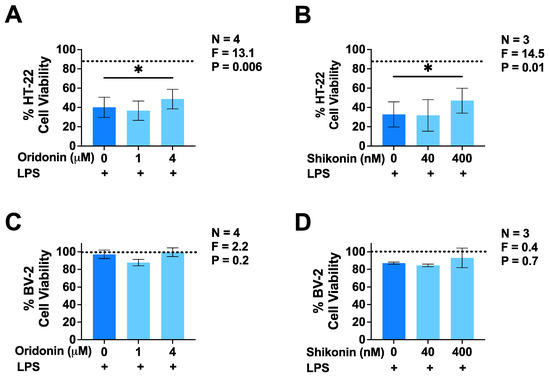 Effects of oridonin and shikonin on the cytotoxicity of LPS-stimulated BV-2 murine microglia cells towards HT-22 murine neuronal cells. Two different concentrations of either drug or the vehicle solution were added to BV-2 cells 30 min before their stimulation with LPS (100 ng/mL). Following 24 h incubation, BV-2 microglia supernatants were transferred onto HT-22 neuronal cell cultures and the viability of BV-2 microglial cells was measured using the MTT assay (C,D). Following an additional 72 h incubation period with BV-2 cell supernatants, the viability of HT-22 neuronal cells was measured using the MTT assay (A,B). Data (mean ± SEM) from three to four independent experiments performed on separate days are presented as a percent of the values obtained from HT-22 neuronal cells exposed to a fresh culture medium only (A,B). * p < 0.05 according to Dunnett’s post hoc test. F- and p-values displayed on the graphs were calculated using a one-way randomized block ANOVA. Dotted lines represent the mean baseline viability of HT-22 neuronal cells incubated in supernatants from unstimulated BV-2 microglial cells (A,B) or viability of unstimulated BV-2 cells (C,D) incubated in the absence of LPS.