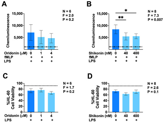 Effects of oridonin and shikonin on the secretion of ROS by differentiated HL-60 human microglia-like cells. Two different concentrations of either drug or the vehicle solution were added to DMSO-differentiated HL-60 cells 30 min before their priming with LPS (500 ng/mL). Following 24 h incubation, cells were stimulated with fMLP (1.2 µM) and luminol-dependent chemiluminescence was measured over a 25 min period (A,B). The viability of differentiated and LPS-primed HL-60 microglia-like cells plated in separate wells was measured using the MTT assay (C,D). Data from six or eight independent experiments performed on separate days are presented as mean ± SEM. * p < 0.05 and ** p < 0.01 according to Dunnett’s post hoc test. F- and p-values displayed on the graphs were calculated using a one-way randomized block ANOVA. The dash-dotted lines represent the luminescence signal from unprimed and fMLP-stimulated HL-60 microglia-like cells (A,B). The dotted lines represent the mean baseline viability of unprimed HL-60 cells incubated in the absence of LPS (C,D).