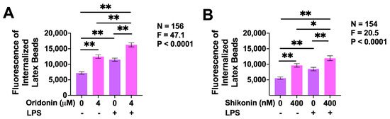 Effects of oridonin and shikonin on the phagocytosis of latex beads by unstimulated and LPS-stimulated BV-2 murine microglia. Oridonin (A) or shikonin (B), or the vehicle solution was added to BV-2 cells for 30 min, followed by 24 h incubation in the presence or absence of LPS (400 ng/mL). Fluorescent latex beads were added at a 10:1 bead-to-cell ratio for 1 h and fluorescence intensity of beads in live cells was measured using a widefield microscope. Data from four independent experiments (N = 154 or 156 cells total for each experimental condition) are presented as mean ± SEM. * p < 0.05 and ** p < 0.01 according to Tukey’s post hoc test. F- and p-values displayed on the graphs were calculated using a one-way ANOVA.