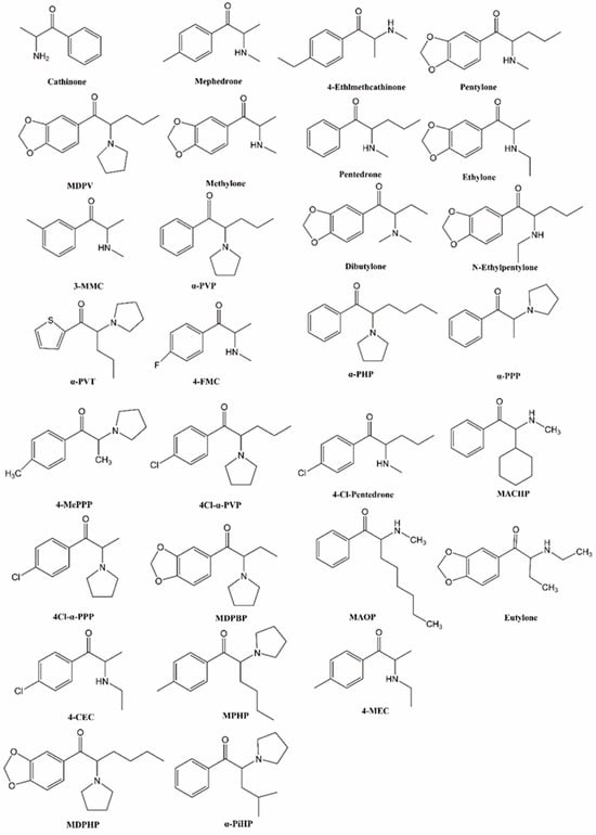 Cathinone (Figure 1), a β-keto analog of amphetamine, is a monoamine alkaloid found in Catha edulis (khat), producing psychostimulant effects akin to substances like amphetamine [1]. Synthetic cathinones (SCs) are β-keto analogues of cathinone, with cathinone’s backbone structure having four modification positions, the aromatic ring (R1), alkyl side chain (R2), and amino group (R3 and R4), allowing for the synthesis of a wide range of derivatives [2,3]. SCs can be classified into four sub-classes based on their structural modifications [3,4]: (1) N-alkyl cathinones, (2) N-pyrrolidine cathinones, (3) 3,4-methylenedioxy-N-pyrrolidine cathinones, and (4) 3,4-methylenedioxy-N-alkyl cathinones. Notably, 4-methylmethcathinone (mephedrone, Figure 1), 3,4-methylenedioxypyrovalerone (MDPV, Figure 1), and 3,4-methylenedioxy-N-methylcathinone (methylone, Figure 1) are the most commonly used SCs.
