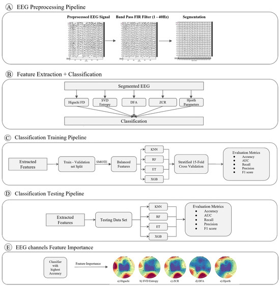 This section introduces an empirical work that compares various feature extraction techniques from EEG data for discriminating subjects with Alzheimer’s disorder and frontotemporal dementia from healthy adults. Figure 1 shows a synthesis of such a novel pipeline that is divided into five phases: (A) a pre-processing pipeline to denoise EEG data and to segment it with a sliding window technique; (B) a phase where various feature extraction techniques for EEG data are contrasted, along with straightforward supervised learning algorithms for classifying frontotemporal dementia subjects from those having Alzheimer’s disorder; (C) a training phase for automatically aggregating the extracted features from the previous step towards predictive models; (D) an evaluation of such models with unseen testing data across various evaluation metrics; (E) an analytical phase for establishing the importance of EEG channels in the discrimination of Alzheimer’s and frontotemporal dementia subjects.