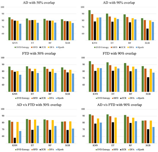 We examined 50% and 90% overlaps for sliding windowing, multiple feature extraction techniques—Higuchi Fractal Dimension, Singular Value Decomposition (SVD) Entropy, Zero Crossing Rate, Detrended Fluctuation Analysis, and Hjorth parameters—to extract salient high-level features from EEG signals and supervised machine learning techniques—K-Nearest Neighbors (KNN), Random Forest (RF), XGBoost, and Extra Trees (ET)—to discriminate frontotemporal dementia, Alzheimer’s disease, and control groups.